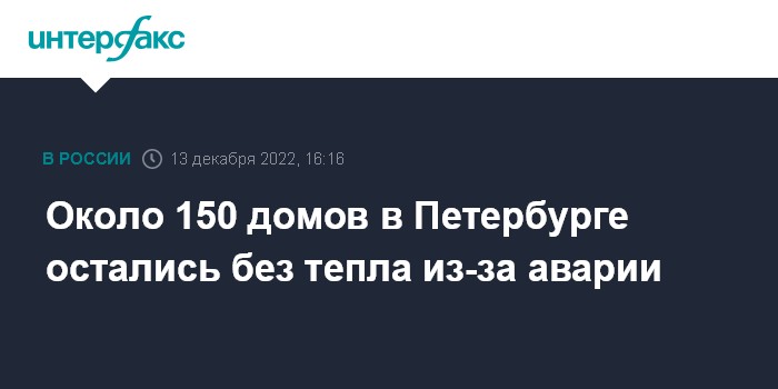 Москва. 13 декабря. INTERFAX.RU - Авария на трубопроводе привела к отключению тепла и горячей воды почти в 150 домах на юго-востоке Петербурга, сообщает пресс-служба администрации Невского района в социальных сетях.