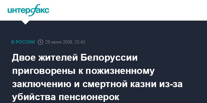 Минск. 29 июня. ИНТЕРФАКС-ЗАПАД - В Белоруссии приговорены к пожизненному заключению и смертной казни двое граждан республики 28-ми и 30-ти лет в связи с убийством шести пенсионерок, сообщает Общенациональное телевидение страны.