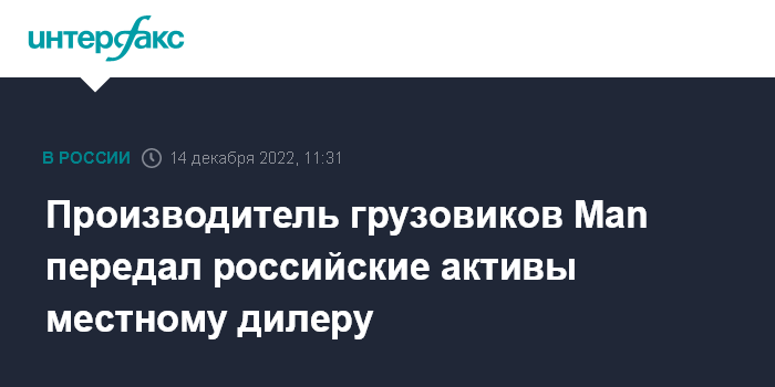 Москва. 14 декабря. INTERFAX.RU - Производитель грузовиков и автобусов Man, входящий в группу Traton германского автоконцерна Volkswagen, передал активы своей российской "дочки" (ООО "Ман Трак энд Бас Рус") местному дилеру марки, следует из данных ЕГРЮЛ.
