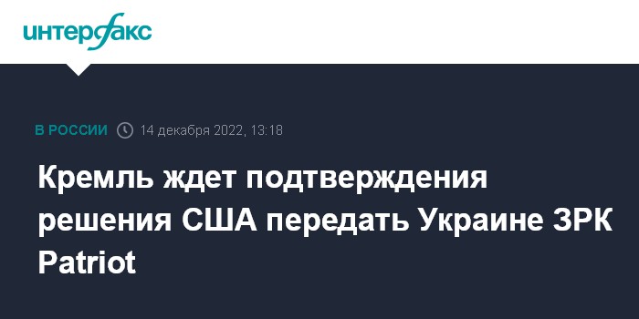 Москва. 14 декабря. INTERFAX.RU - В Кремле ждут официального подтверждения информации СМИ о том, что США решили поставить Украине противоракетные комплексы Patriot.