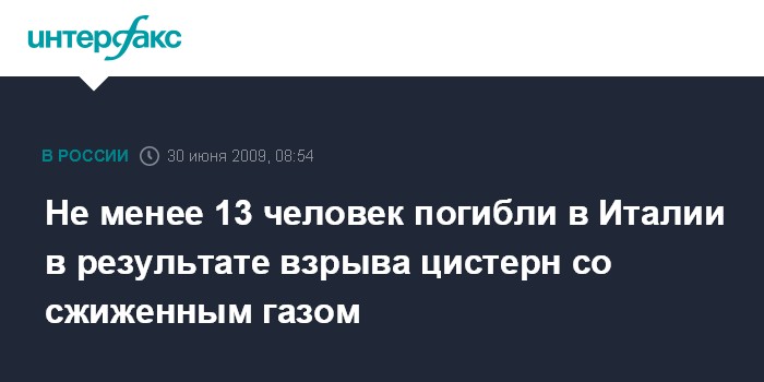 Москва. 30 июня. INTERFAX.RU - До 13 человек увеличилось количество жертв взрыва цистерн со сжиженным газом на железнодорожной станции итальянского города Виареджо, сообщает интернет-сайт итальянской газеты "Репубблика".