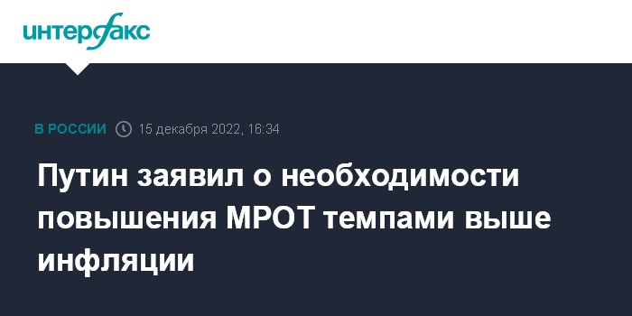 Москва. 15 декабря. INTERFAX.RU - Президент РФ Владимир Путин заявил о необходимости дальнейшего повышения минимального размера оплаты труда (МРОТ).