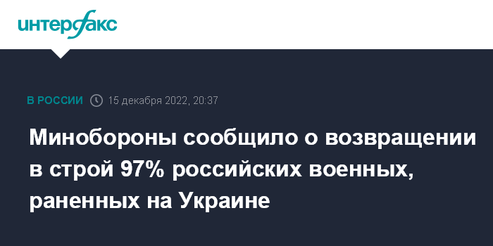 Москва. 15 декабря. INTERFAX.RU - В Минобороны заявили, что до 97% российских военнослужащих возвращаются в строй после ранений, полученных в ходе специальной военной операции на Украине.