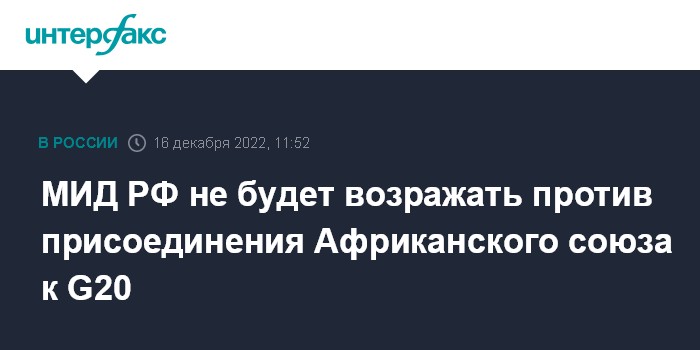 Москва. 16 декабря. INTERFAX.RU - Россия не против вступления Африканского союза в "Группу двадцати", заявил замглавы МИД РФ Михаил Богданов.