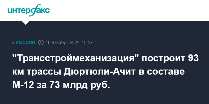 Москва. 16 декабря. INTERFAX.RU - ООО "Трансстроймеханизация" (ТСМ, входит в АО "Дороги и мосты") по заказу госкомпании "Автодор" построит 93-километровый этап платной автотрассы от города Дюртюли (Башкирия) до поселка Ачит (Свердловская обл.) в составе магистрали М-12 на участке от Казани до Екатеринбурга, следует из материалов сайта госзакупок.