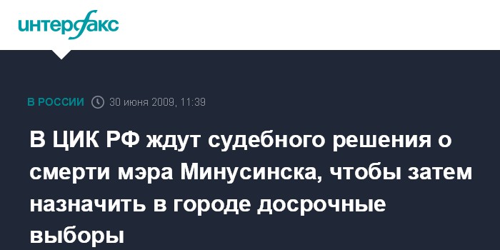 Москва. 30 июня. INTERFAX.RU – Досрочные выборы мэра Минусинска могут быть назначены только после установления судом факта смерти главы города Анатолия Кекина, сообщили в Центризбиркоме.