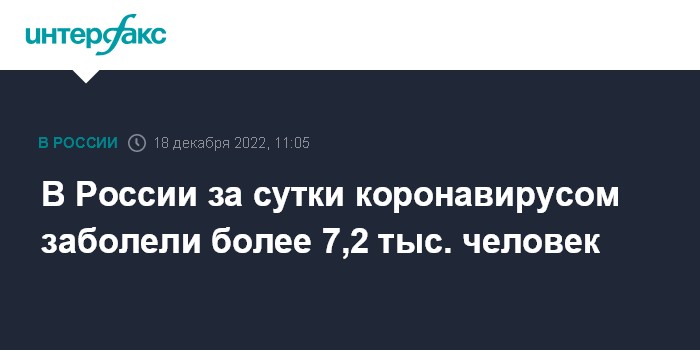Москва. 18 декабря. INTERFAX.RU - Суточный прирост новых заболевших коронавирусной инфекцией в РФ составил 7 222 случая, следует из данных оперативного штаба, обнародованных в воскресенье.