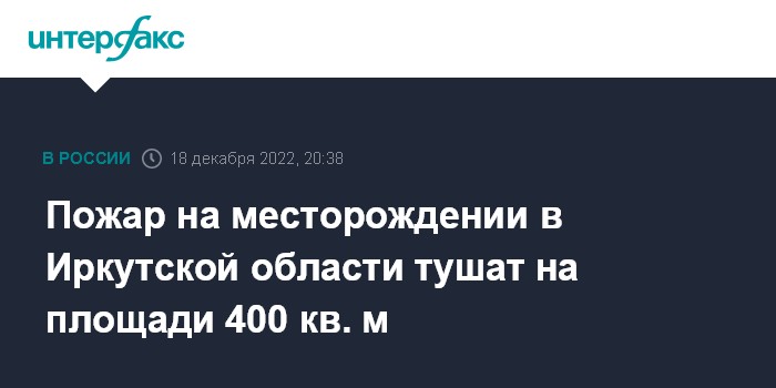 Москва. 18 декабря. INTERFAX.RU - Площадь пожара на Марковском нефтегазоконденсатном месторождении в Иркутской области, по последним данным, составляет 400 кв. м, сообщается в телеграм-канале главного управления МЧС по региону.