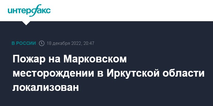 Москва. 18 декабря. INTERFAX.RU - Возгорание на Марковском месторождении локализовано, погибших нет, сообщили Интерфаксу в пресс-службе "Иркутской нефтяной компании" (ИНК, владелец месторождения).