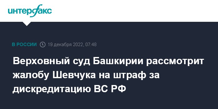 Москва. 19 декабря. INTERFAX.RU - Верховный суд Башкирии, как ожидается, в понедельник рассмотрит жалобу на решение о назначении штрафа лидеру группы ДДТ Юрию Шевчуку по административному протоколу о дискредитации Вооруженных сил РФ, следует из картотеки суда.