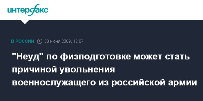 Москва. 30 июня. INTERFAX.RU – Министерство обороны намерено увольнять военнослужащих, которые не сдадут зачеты по физической подготовке, сообщил "Интерфаксу-АВН" начальник управления по физподготовке российского военного ведомства полковник Александр Щепелев.