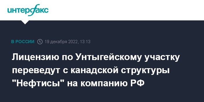 Лицензию по Унтыгейскому участку переведут с канадской структуры "Нефтисы" на компанию РФ