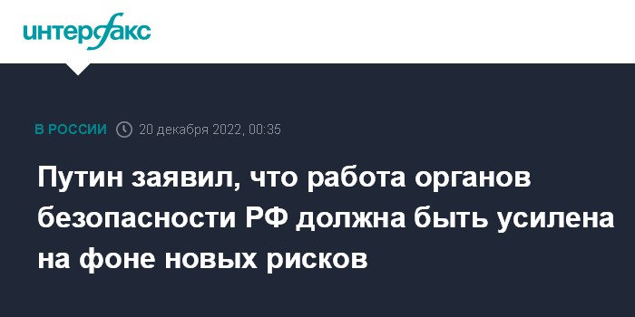 Москва. 20 декабря. INTERFAX.RU - Президент РФ Владимир Путин заявил, что работа органов безопасности России должна быть усилена на фоне новых рисков, а стратегические объекты инфраструктуры находиться под постоянным контролем спецслужб.