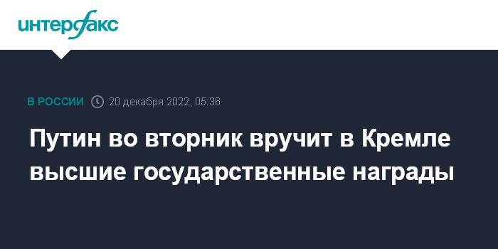 Москва. 20 декабря. INTERFAX.RU - Президент РФ Владимир Путин во вторник, 20 декабря в Екатерининском зале Кремля примет участие в церемонии вручения государственных наград, сообщила пресс-служба Кремля.
