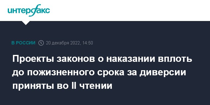 Москва. 20 декабря. INTERFAX.RU - Госдума во вторник приняла во втором чтении пакет законопроектов об уголовном наказании за осуществление диверсионной деятельности.