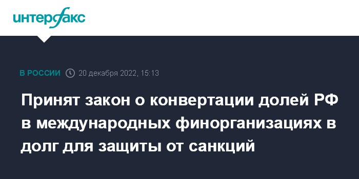 "Установить, что в 2023 г. по достижении соответствующих договоренностей с международными финансовыми организациями правительство РФ вправе принять решение о конвертации доли участия РФ в международных финансовых организациях в финансовые обязательства международных финансовых организаций перед РФ с возможностью по инициативе правительства РФ обратной конвертации таких финансовых обязательств в доли участия РФ в международных финансовых организациях на условиях, не ухудшающих первоначальных условий конвертации", - говорится в тексте принятого закона.