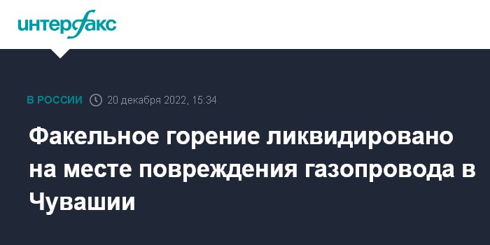 Москва. 20 декабря. INTERFAX.RU - Факельное горение на месте повреждения газопровода в Вурнарском районе Чувашии ликвидировано, сообщило ГУ МЧС по региону в телеграм-канале во вторник.