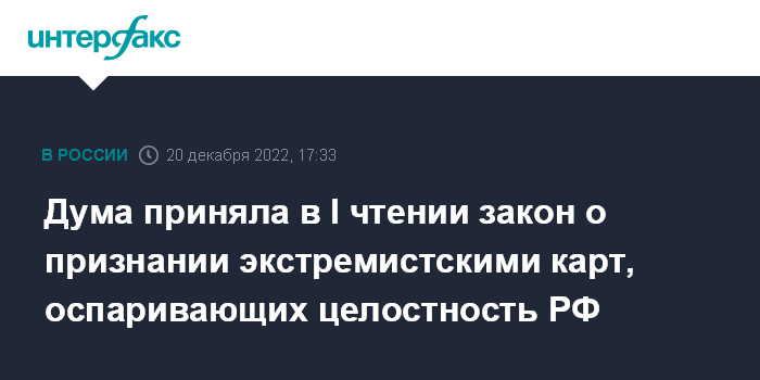 Законопроектом (№196548-8) предлагается отнести к экстремистским материалам предназначенные для распространения либо публичного демонстрирования картографические и иные изображения и продукцию, оспаривающие территориальную целостность Российской Федерации.