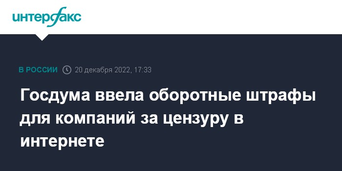 Москва. 20 декабря. INTERFAX.RU - Госдума приняла в третьем чтении поправки в КоАП, которые вводят для информационных интернет-ресурсов оборотные штрафы за цензуру. До сих пор эти штрафы были фиксированными: их максимальный размер составлял 3 млн рублей.