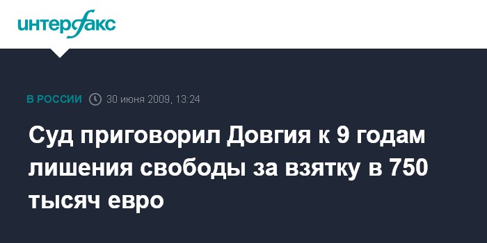 Москва. 30 июня. INTERFAX.RU - Мосгорсуд приговорил бывшего руководителя Главного следственного управления Следственного комитета при прокуратуре (ГСУ СКП) РФ Дмитрия Довгия к 9 годам лишения свободы за получение взятки в 750 тыс. евро.