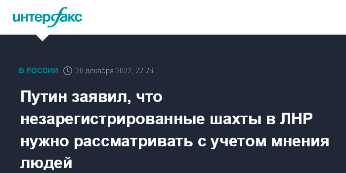Москва. 20 декабря. INTERFAX.RU - Президент РФ Владимир Путин предложил решать вопрос о судьбе незарегистрированных угольных предприятий ЛНР с учетом мнения местного населения и в консультациях с правительством РФ.