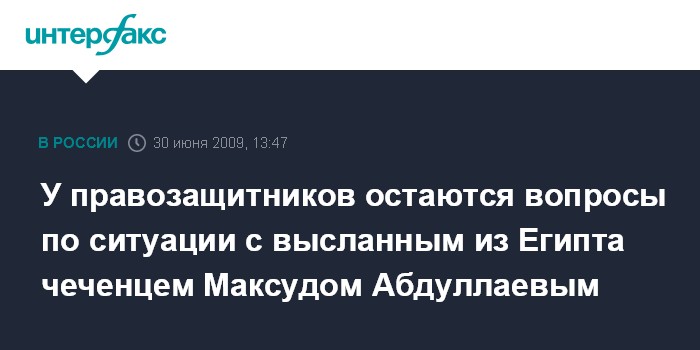 Москва. 30 июня. INTERFAX.RU - Правозащитники рады, что депортированный из Египта в Россию студент, сын одного из лидеров чеченских боевиков Максуд Абдуллаев нашелся в Чечне, но заявляют, что у них есть вопросы по поводу того, как он там оказался.