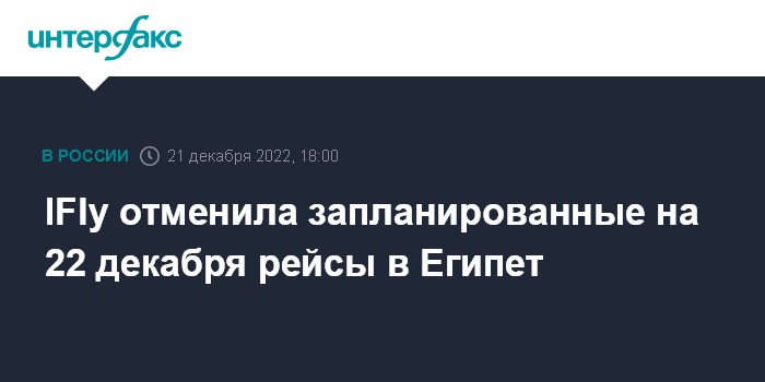 "IFly вынужденно отменяет вылеты в Хургаду и Шарм-эш-Шейх, которые должны были состояться 22 декабря. Об этом перевозчик уведомил нас сегодня. О дополнительных вариантах авиаперелета из Египта в связи с отменой рейса на 22 декабря информация ожидается в ближайшее время. Вывозные рейсы для туристов, которые находятся на курортах Египта в связи с вынужденной приостановкой полетной программы на этом направлении, с 15 декабря выполняются в плановом режиме", - пояснили в компании.