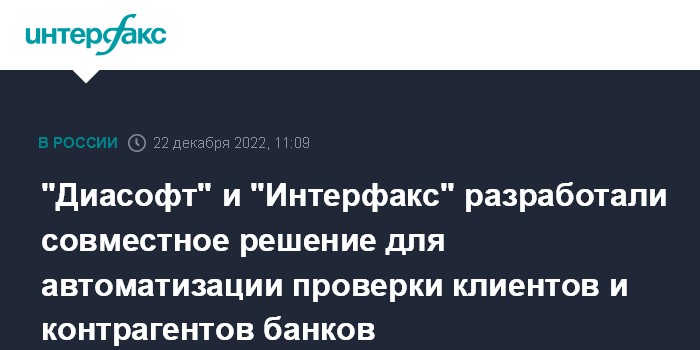 Москва. 22 декабря. INTERFAX.RU - Компания "Диасофт" автоматизировала комплексную проверку клиентов и контрагентов по параметрам и спискам, доступным в решении X-Compliance, созданном Группой "Интерфакс".