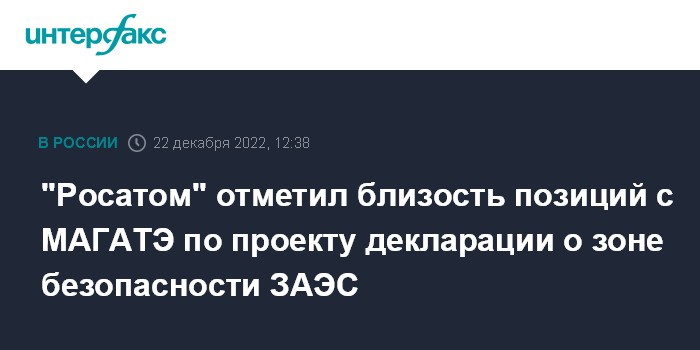 Москва. 22 декабря. INTERFAX.RU - На консультациях в Москве российской делегации и делегации МАГАТЭ по Запорожской АЭС отмечена близость позиций сторон по проекту декларации о создании зоны безопасности вокруг станции, сообщил телеграм-канал "Росатома".