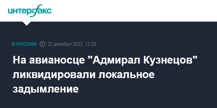"22 декабря в одном из помещений ТАВКР "Адмирал Кузнецов" произошло локальное задымление. Аварийной партией корабля и сотрудниками специальных служб оно было оперативно ликвидировано", - сказал он.