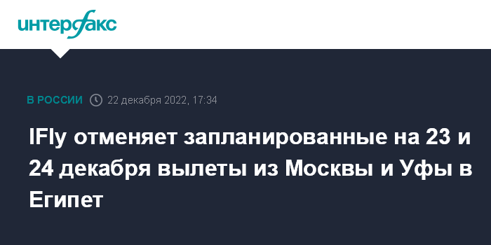 "В связи с тем, что принятие решения уполномоченными органами государственной власти РФ затягивается, авиакомпания IFly вынужденно отменяет вылеты в Хургаду и Шарм-эль-Шейх, которые должны были состояться из Москвы 23 декабря, а также из Уфы 24 декабря ", - рассказали в компании.