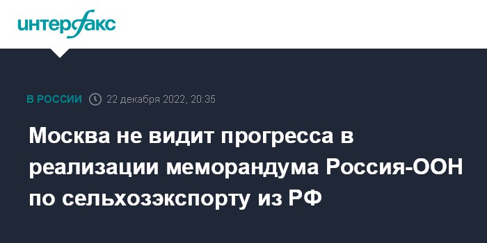 Москва. 22 декабря. INTERFAX.RU - МИД РФ констатирует отсутствие прогресса в реализации меморандума Россия-ООН по нормализации отечественного сельхозэкспорта.
