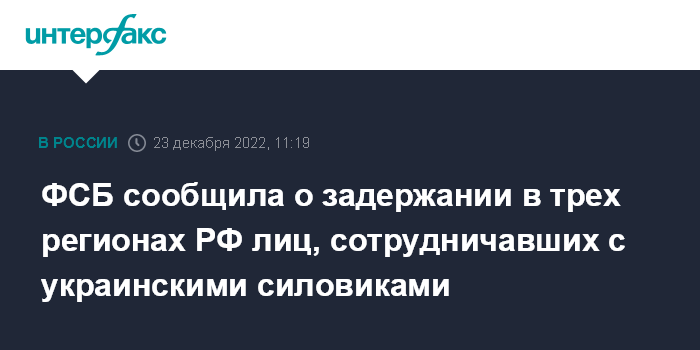 ФСБ сообщила о задержании в трех регионах РФ лиц, сотрудничавших с украинскими силовиками