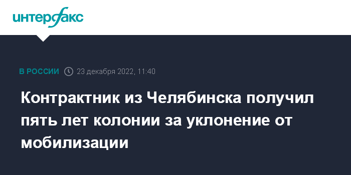 Москва. 23 декабря. INTERFAX.RU - Челябинский гарнизонный военный суд приговорил к пяти годам и одному месяцу колонии общего режима рядового-контрактника, который самовольно оставил место службы и не явился в часть после объявления мобилизации, сообщила пресс-служба суда.