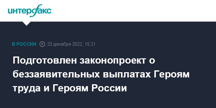 Москва. 23 декабря. INTERFAX.RU - Правительство разработало законопроект об автоматическом, без необходимости подачи заявления, назначении выплаты после получения звания Героя труда и Героя России, сообщил премьер-министр Михаил Мишустин.