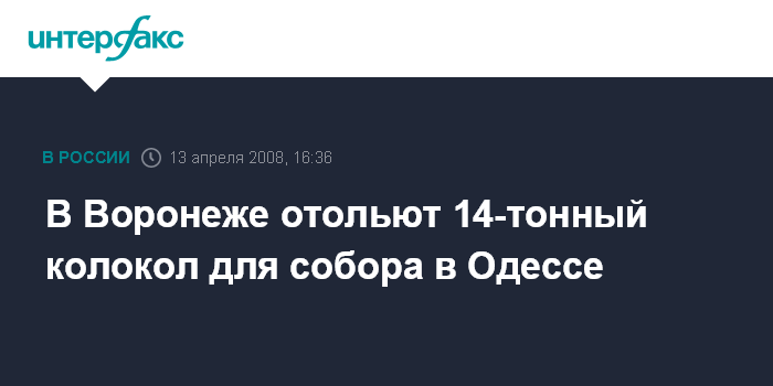 Воронеж. 13 апреля. ИНТЕРФАКС-ЦЕНТР - Воронежский колокололитейный завод "Вера" изготовит для Спасо-Преображенского монастыря в Одессе колокол весом 14 тонн, сообщил "Интерфаксу" представитель завода.