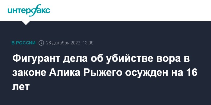 Москва. 26 декабря. INTERFAX.RU - Суд в Москве приговорил к 16 годам колонии строгого режима фигуранта дела об убийстве Али Гейдарова, имеющего в преступном мире статус вора в законе, сообщила в понедельник столичная прокуратура.