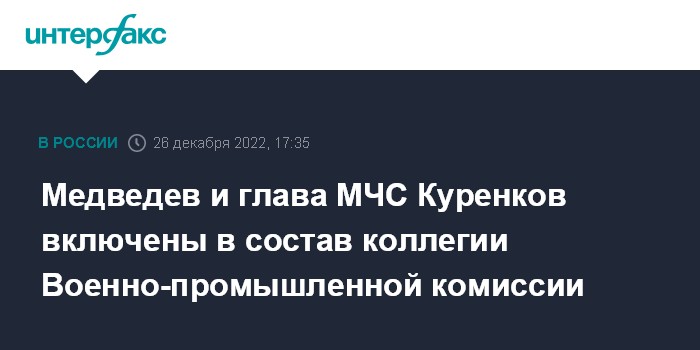 Москва. 26 декабря. INTERFAX.RU - Президент РФ Владимир Путин включил заместителя председателя Совета Безопасности РФ Дмитрия Медведева в состав Военно-промышленной комиссии и в состав коллегии ВПК.