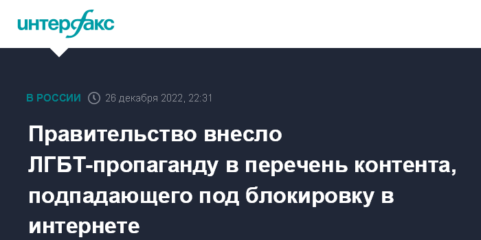 Москва. 26 декабря. INTERFAX.RU - Правительство России внесло информацию, пропагандирующую нетрадиционные сексуальные отношения, педофилию и смену пола в перечень контента для внесения в реестр запрещенной в РФ информации в интернете по решению Роскомнадзора (РКН).