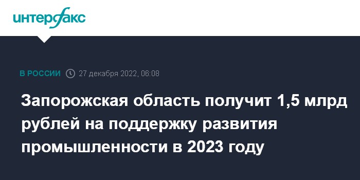 Москва. 27 декабря. INTERFAX.RU - Фонд развития промышленности Запорожской области получит 1,5 млрд рублей из федерального бюджета для поддержки предприятий в 2023 году, сообщил журналистам глава правительства региона Антон Кольцов.