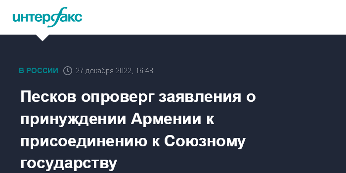 Москва. 27 декабря. INTERFAX.RU - Пресс-секретарь президента РФ Дмитрий Песков назвал провокационным высказывание секретаря Совбеза Армении Армена Григоряна о том, что Россия якобы принуждает Армению предоставить коридор через свою территорию Азербайджану, а также присоединиться к Союзному государству России и Белоруссии, сообщает портал NEWS.am.