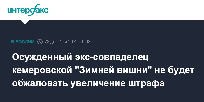 Осужденный экс-совладелец кемеровской "Зимней вишни" не будет обжаловать увеличение штрафа