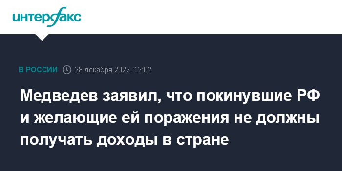 Москва. 28 декабря. INTERFAX.RU - Уехавшие за границу россияне, желающие поражения своей стране, должны быть полностью отрезаны от источников доходов в РФ, заявил зампредседателя Совбеза РФ Дмитрий Медведев.