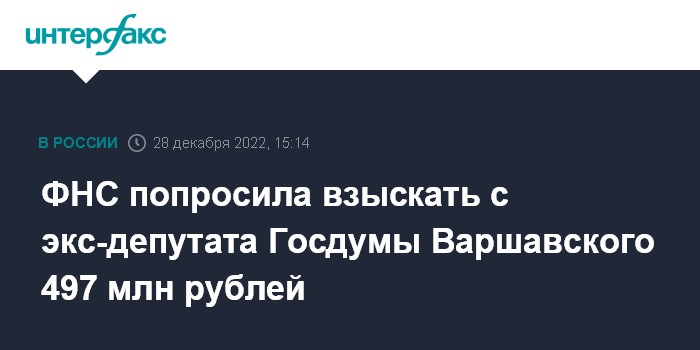ФНС попросила взыскать с экс-депутата Госдумы Варшавского 497 млн рублей