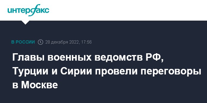 Москва. 28 декабря. INTERFAX.RU - Главы военных ведомств РФ, Турции и Сирии в среду провели трехсторонние переговоры в Москве, обсуждены пути разрешения сирийского кризиса, сообщили в Минобороны России.