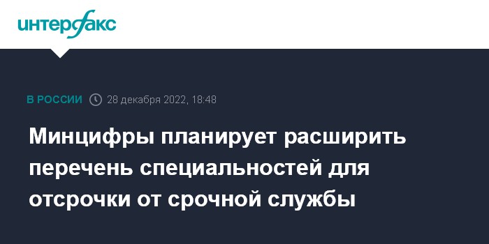 Москва. 28 декабря. INTERFAX.RU - Минцифры РФ планирует расширить перечень специальностей, по которым должна предоставляться отсрочка от срочной военной службы, сообщил глава ведомства Максут Шадаев.
