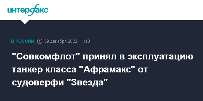 Москва. 29 декабря. INTERFAX.RU - Группа "Совкомфлот" приняла в эксплуатацию построенный на судостроительном комплексе "Звезда" (ССК, создается консорциумом во главе с НК "Роснефть") нефтеналивной танкер "Океанский проспект" типоразмера "Афрамакс" на СПГ-топливе, сообщил СКФ.