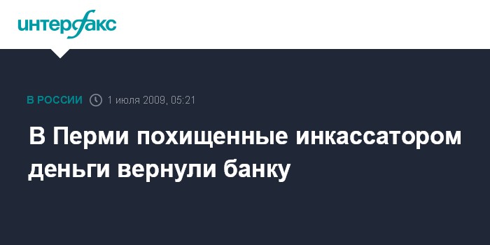 Пермь. 1 июля. ИНТЕРФАКС-ПОВОЛЖЬЕ - Деньги, которые были похищены при ограблении инкассаторской машины в Перми, возвращены в банк, сообщил агентству "Интерфакс-Поволжье" министр общественной безопасности Пермского края Игорь Орлов.