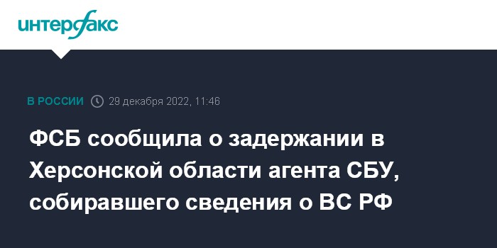 Москва. 29 декабря. INTERFAX.RU - ФСБ сообщила о задержании в Херсонской области агента украинских спецслужб, собиравшего сведения о местах дислокации и численности подразделений Вооруженных сил РФ в зоне специальной военной операции.