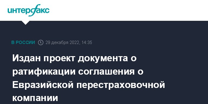 Москва. 29 декабря. INTERFAX.RU - Правительство России опубликовало проект постановления о ратификации соглашения о создании Евразийской перестраховочной компании (ЕПК) на сайте федерального портала проектов нормативных актов.